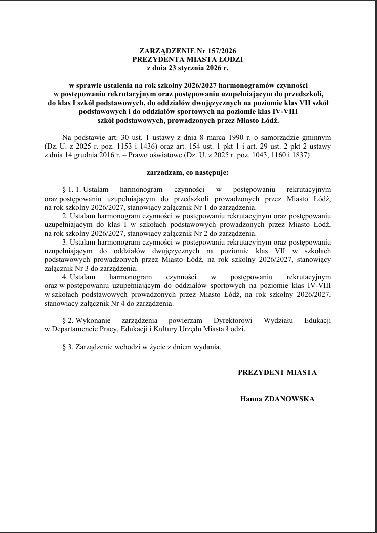 ZARZĄDZENIE Nr 157/2026 PREZYDENTA MIASTA ŁODZI z dnia 23 stycznia 2026 r.